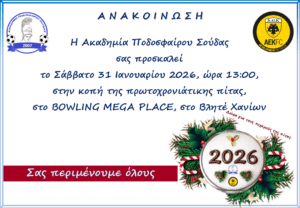 Την ετήσια εκδήλωσή της για την κοπή της πίτας θα πραγματοποιήσει η Ακαδημία Ποδοσφαίρου Σούδας το Σάββατο 31 Ιανουαρίου 2026