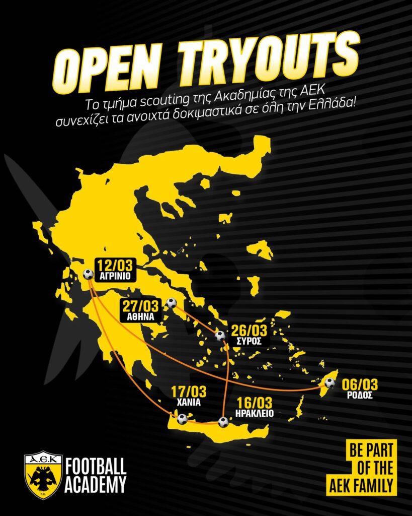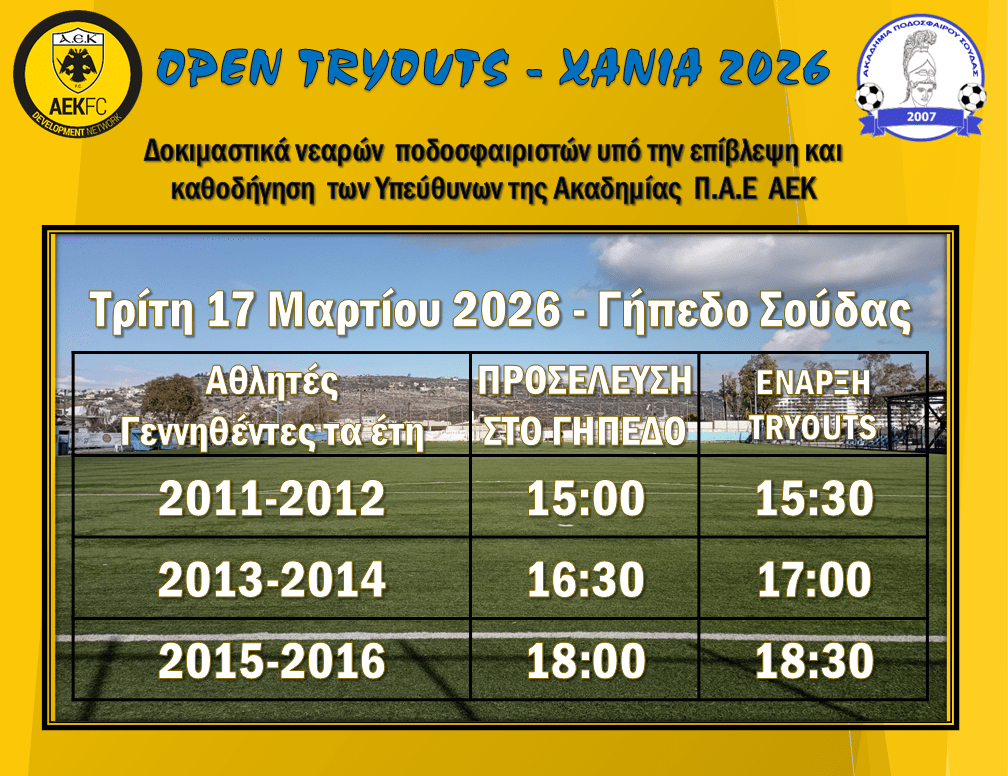 Λόγω της διεξαγωγής της δραστηριότητας Καταγραφής Ικανοτήτων νεαρών ποδοσφαιριστών στα Χανιά (OPEN TRYOUTS), που θα πραγματοποιηθεί την Τρίτη 17 Μαρτίου 2026 στο γήπεδο της Σούδας το πρόγραμμα των προπονήσεων για όλους τους αθλητές της Ακαδημίας γεννηθέντες τα έτη 2011, 2012, 2013, 2014, 2015 και 2016 διαμορφώνεται όπως παρακάτω :