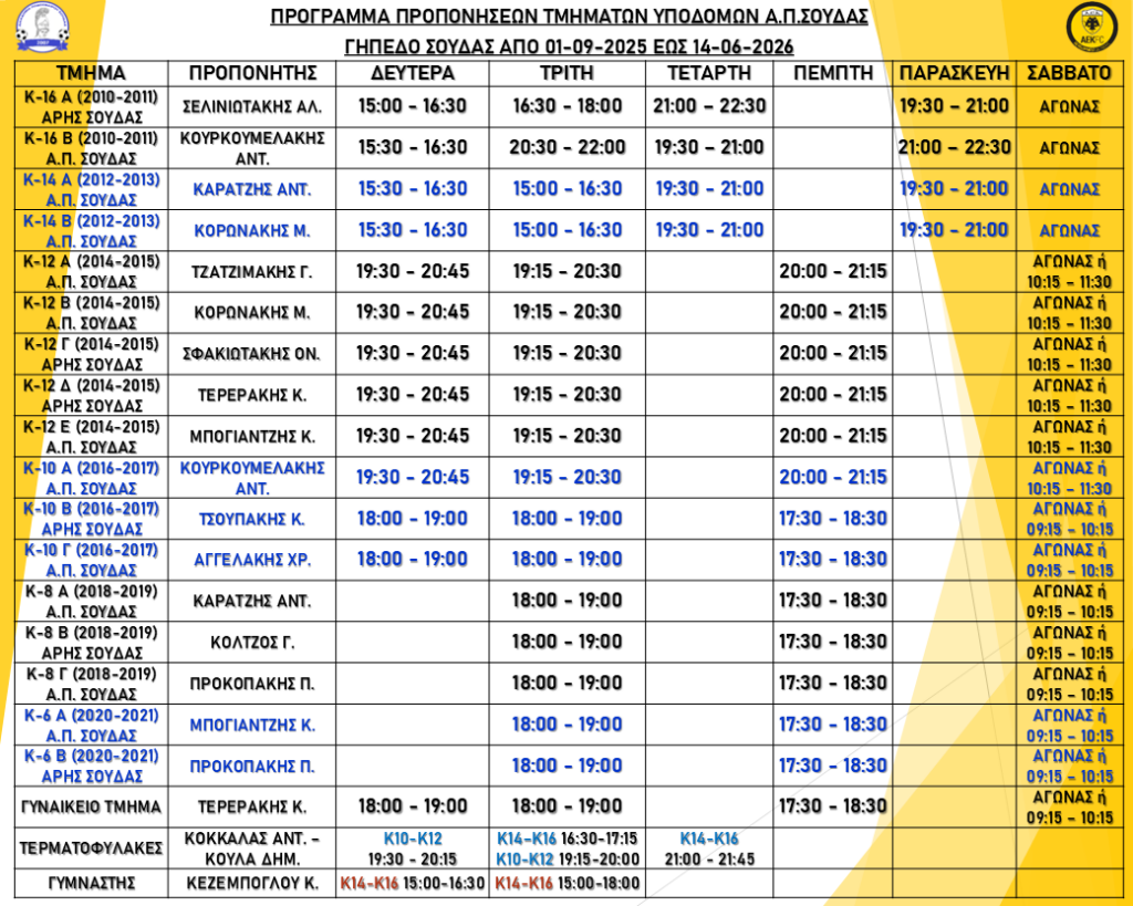 Κ14–Κ16 16:30-17:15 Κ10-Κ12 19:15-20:00 |