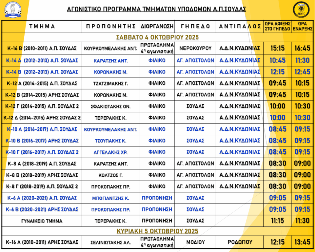 Αγωνιστικό Πρόγραμμα Υποδομών Α.Π.Σούδας | Σαβ 4 & Κυρ 5 Οκτωβρίου 2025