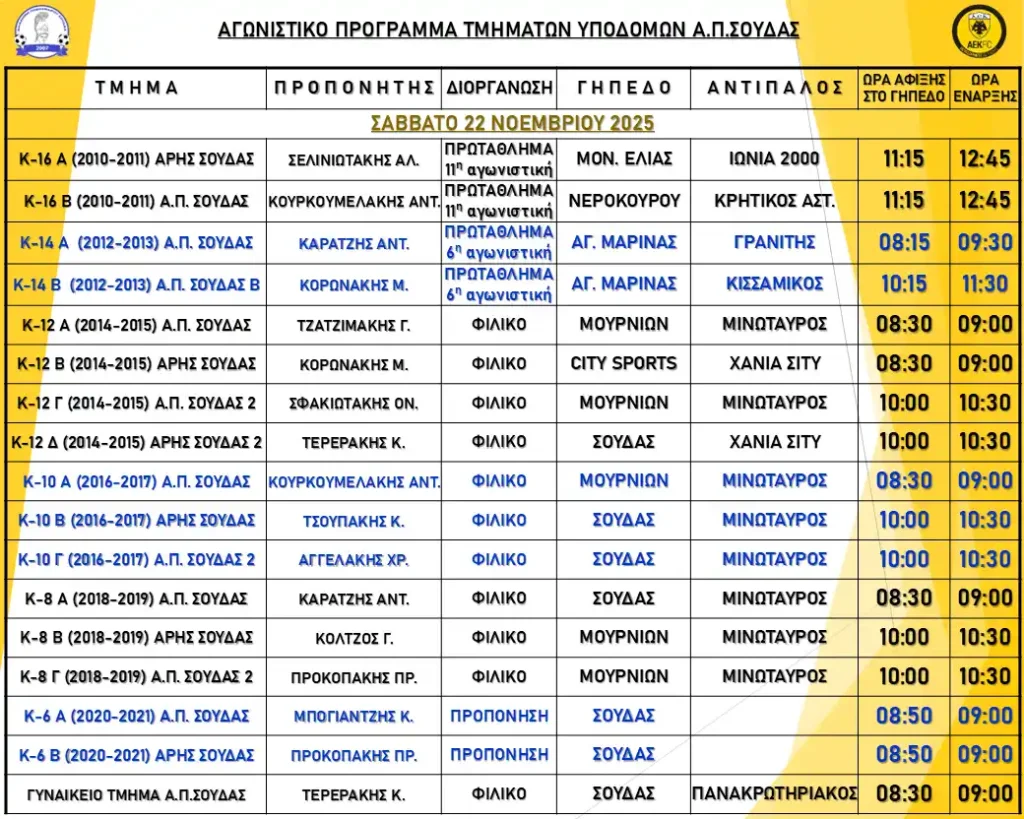 Αγωνιστικό Πρόγραμμα Υποδομών Α.Π.Σούδας | Σαβ 22 Νοεμβρίου 2025